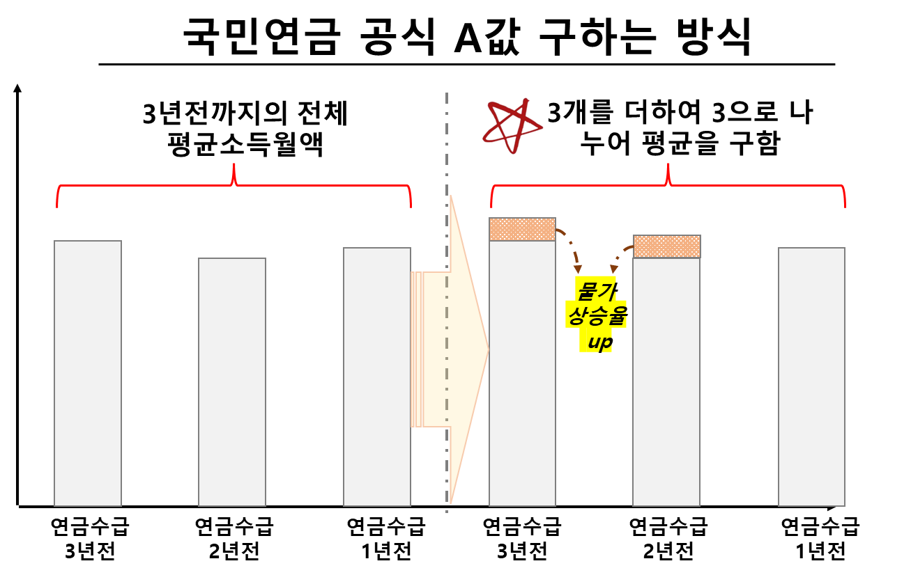 우선 A부터 쉽게 말씀드리자면, 나의 소득이 아닌 국민연금 전체 가입자의 평균소득이라고 이해하시면 됩니다. 아래 그림과 같이 연금수급 1년 전 vs 연금수급 2년 전 vs 연금수급 3년 전의 각각의 값을 물가 상승률을 감안하여 1년 전의 평균소득월액으로 환산합니다. 그리고 세 개의 값을 더하여 3으로 나누어 평균을 구합니다. 이것이 바로 상수 A값을 구하는 공식입니다.