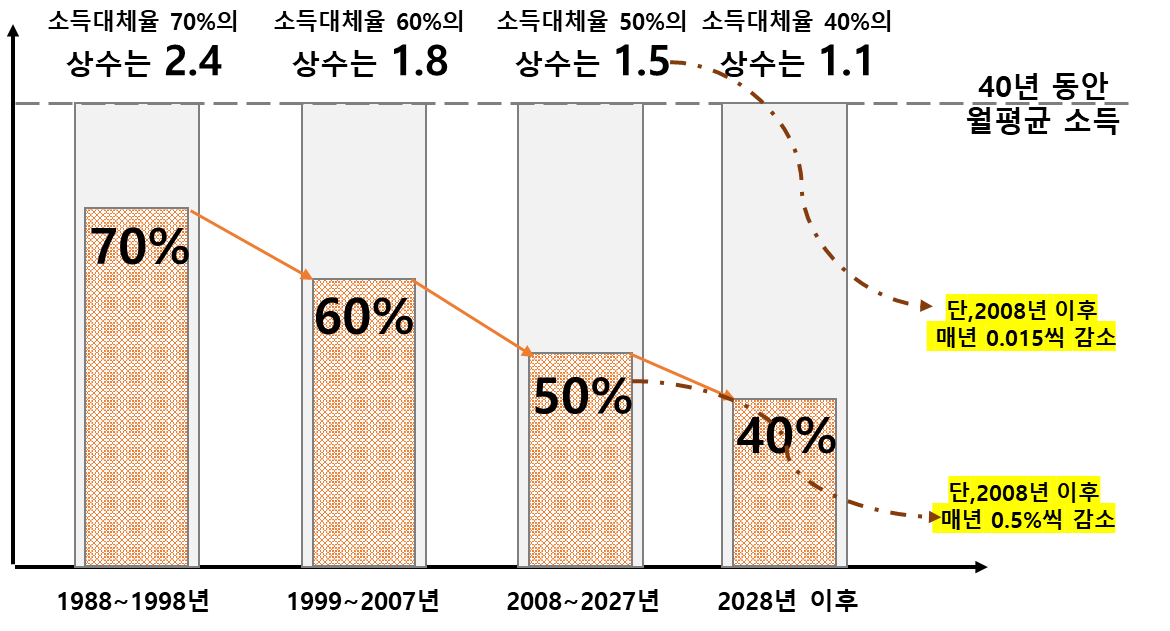 사실 소득대체율은 보험을 납부하는 우리가 결정하는 것은 아닙니다. 그렇기 때문에 이 부분은 우리가 국가에서 정하는 대로 그저 따라가는 방법밖에 없습니다.