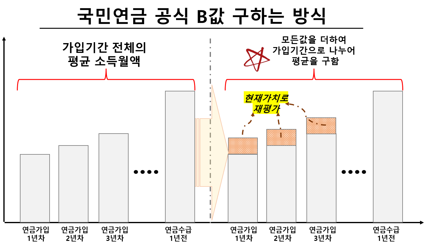 아래 그림과 같이 평생 동안 내가 납입한 평균소득월액을 연도별로 구한 다음 그 값을 현재가치로 재평가하여 각각의 소득월액을 구하고, 소득월액의 총합을 가입 연도 나누어 평균을 구합니다. 당연한 이야기겠지만 많이 낸 만큼 B값은 당연히 상승하게 되어 있습니다.