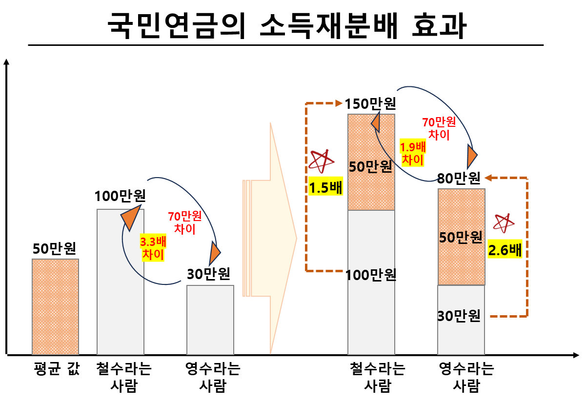 만일 소득 재분배 없이 납입한 만큼 받는다면 철수는 100만 원 vs 영수는 30만 원으로 철수는 영수보다 3.3배 많이 받습니다. 하지만 여기에 평균인 A값 50만 원을 더하여 총 A+B라 환산하면, 철수는 150만 원 vs 영수는 80만 원이 되어 철수는 영수보다 1.9배만 더 받게 됩니다. 그리하여 국민연금에는 낸 만큼 공평하게 많이 받는 개념이 아닌, '소득 재분배 효과'로 빈부의 격차를 줄이고자 하는 의도가 숨겨져 있습니다.