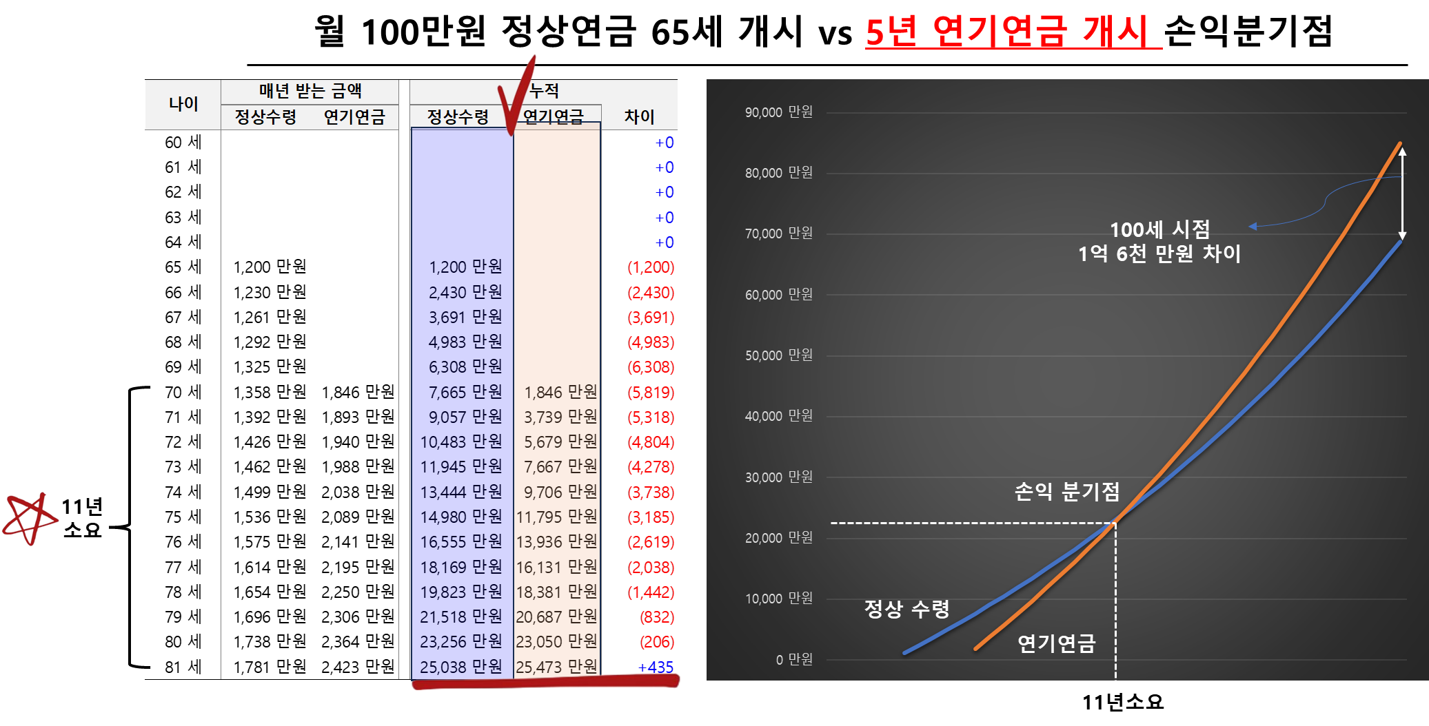 - 손익분기점은 연기연금을 개시한 지 11년이 되는 만 81세가 되면 정상연금 대비 누적 연금수령액이 역전됩니다.