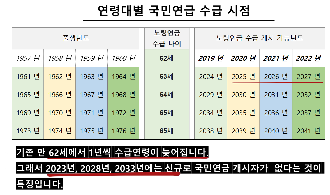 아래 그림은 현재 기준으로 출생연도별 국민연금(노령연금)에 대한 개시시점을 정리한 것입니다.