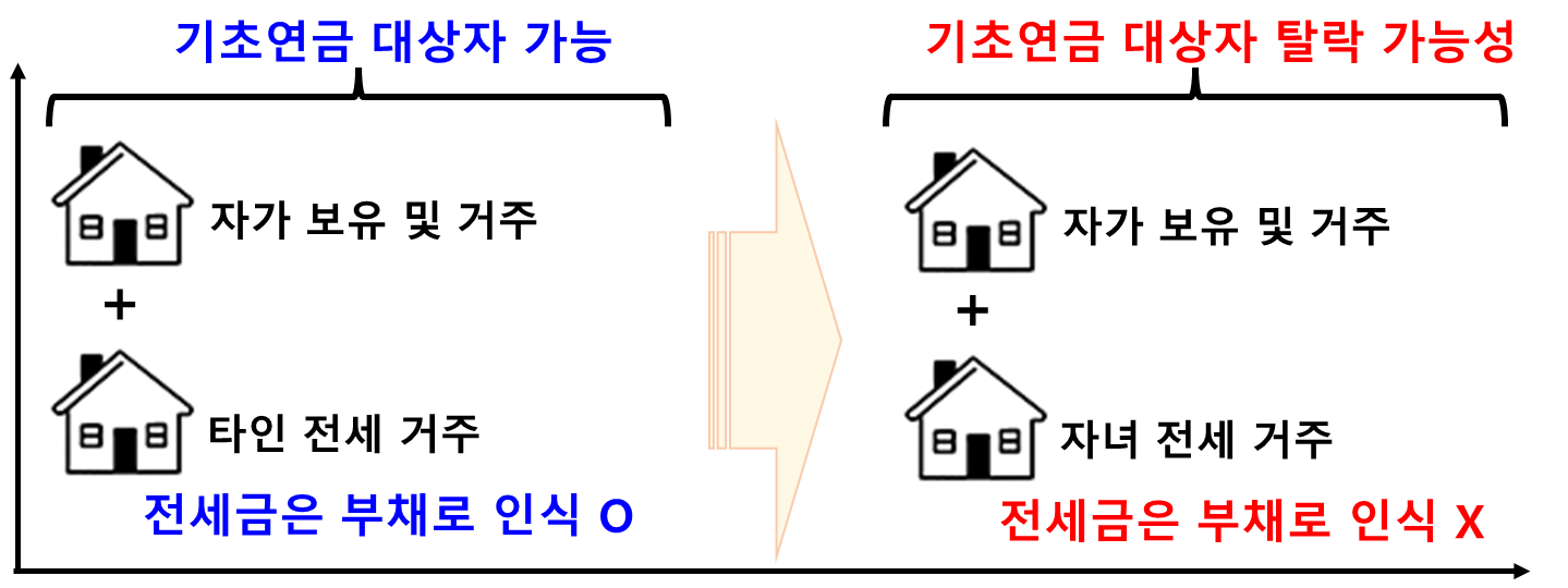 이런 경우에 때로는 기존 기초연금을 받으시던 분들이 기초연금에 탈락하는 경우가 발생합니다. 기초연금법에서는 본인의 배우자나 자녀, 형제, 자매 간에 체결한 임대차계약서에 따른 임대 보증금은 부채로 인정하지 않습니다. 기초연금을 수급받기 위하여 부채로 인식되는 보증금을 지나치게 높게 책정할 수 있기 때문입니다.