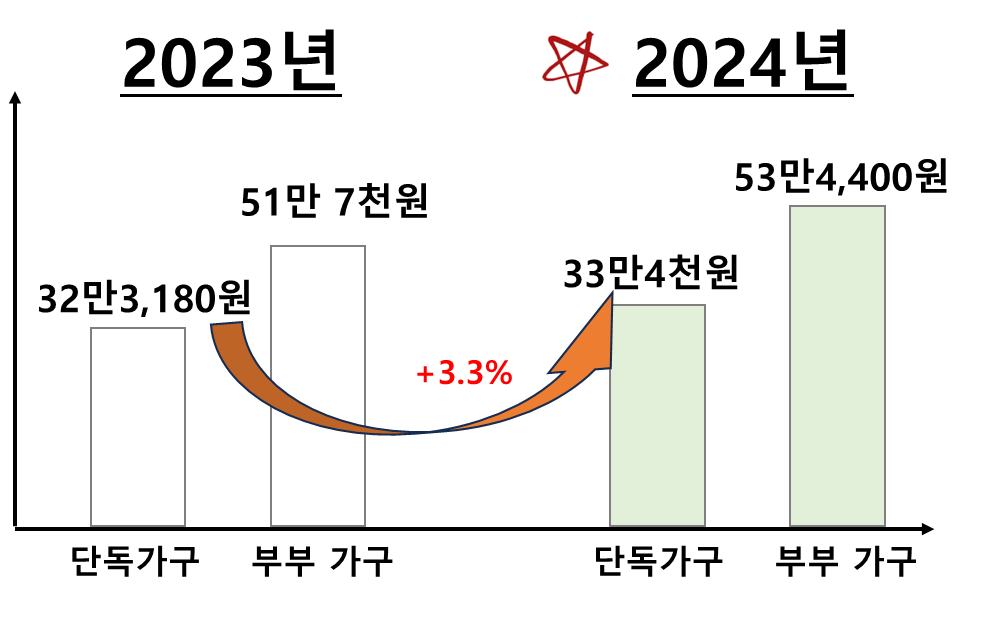 그리고 기초연금은 2023년 대비 2024년에는 단독가의 경우에는 33만 4천 원, 부부가구의 경우에는 53만 4,400원까지 2023년 대비 3.3% 올랐습니다.