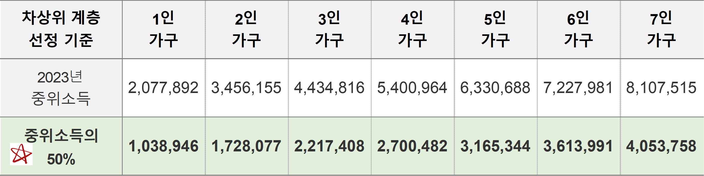 카드발급 기간은 2023.2.1 ~ 2023.11.30일까지이며, 차상위계층은 기초 생활수급자로 선정되지 않으신 분들 중에서 아래와 같이 중위소득 기준으로 50% 이하의 분들을 대상으로 합니다.
