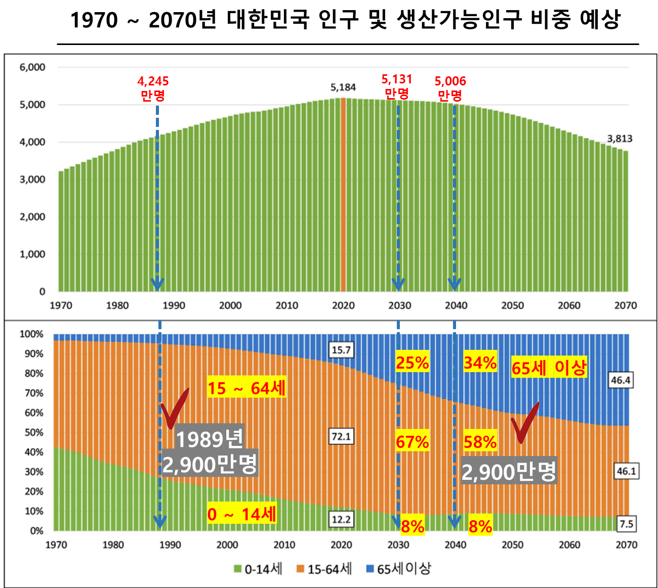 - 2040년 대한민국의 총인구는 5,006만 명이고, 생산가능 인구는 2,900만 명, 65세 이상은 1,700만 명 예정입니다.