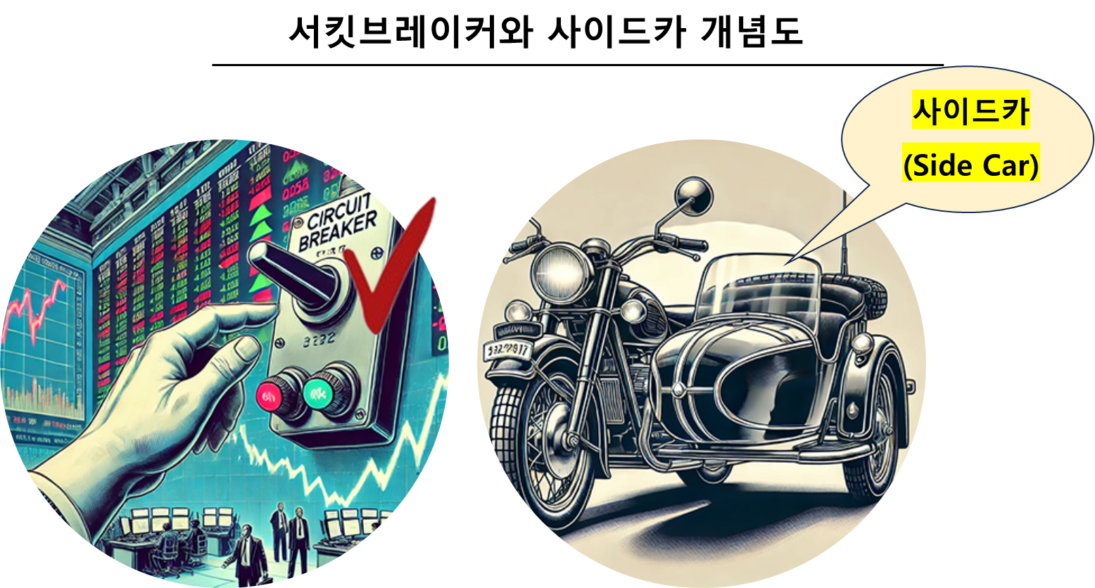 • 사이드카(Side Car) 란 용어 자체에서 무언가 메인이 아닌 보조의 느낌을 줍니다. 그래서 사이드카현물시장이 아닌 선물시장에서의 변동성에 따라 발동됩니다. 즉 선물시장에서의 급격한 변동성이 곧 현물시장에도 동일하게 옮겨갈 가능성이 크므로 서킷브레이커가 발동하기 전에 사이드카라는 안전장치를 만들어 놓은 것입니다.