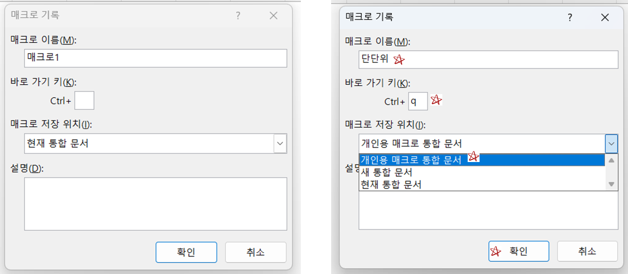 그리고 가장 중요한것이 매크로 저장 위치를 반드시 개인용 매크로 통합 문서로 해 주셔야 합니다. 그래야 모든 엑셀에 자동적으로 적용되기 때문입니다. 마지막에 확인버튼까지 눌러 줍니다.