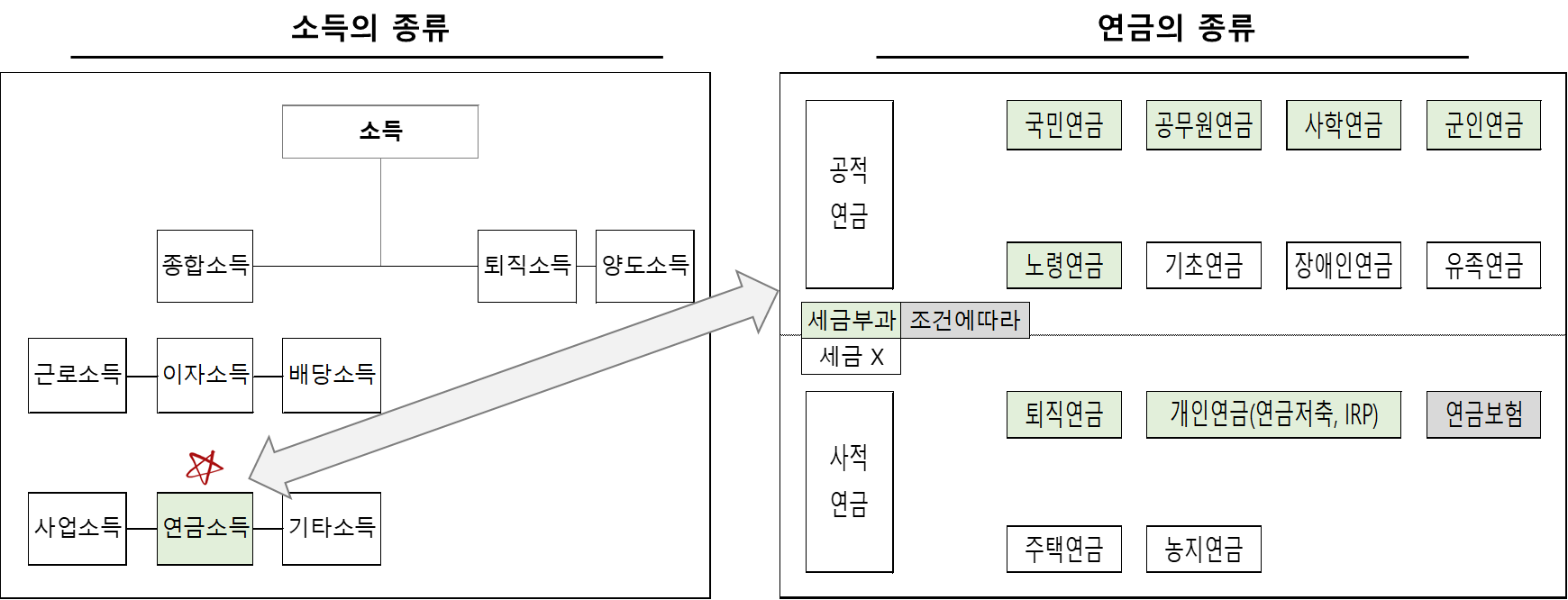 • 세금부과 연금 : 공적연금에 속하는 국민연금, 공무원연금, 사학연금, 군인연금, 노령연금이며, 사적연금에는 퇴직연금 개인연금(연금저축, IRP) 등이 속합니다.
