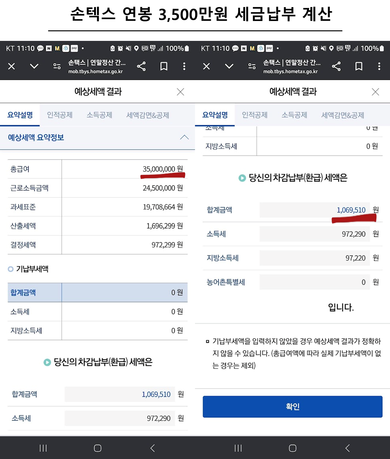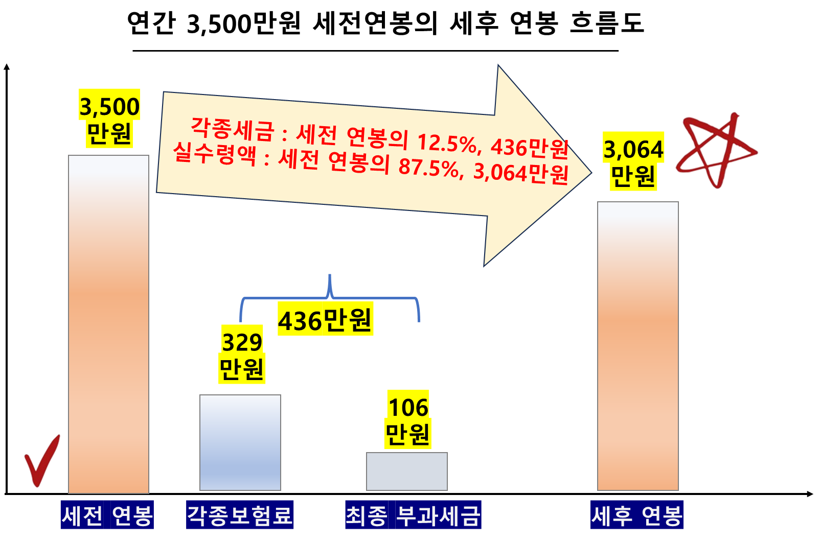 - '세전 기준 연봉 3,500만 원 - 1,050만 원 = 2,450만 원'이 되었습니다.