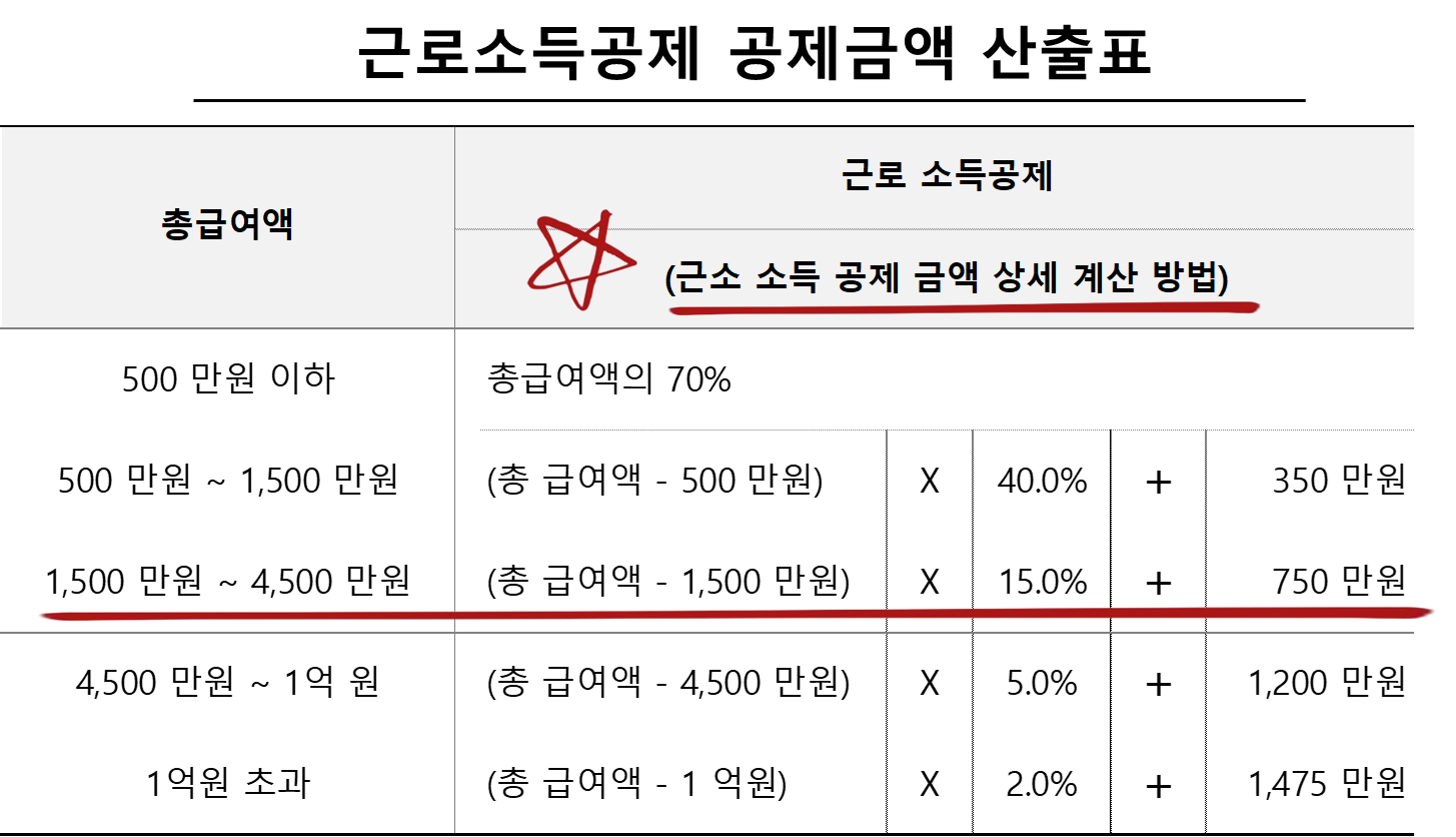 - 근로소득공제로 산출된 1,050만 원만큼 내 연봉에서 빼줍니다. 그만큼 납부해야 할 세금이 줄어드는 것입니다.