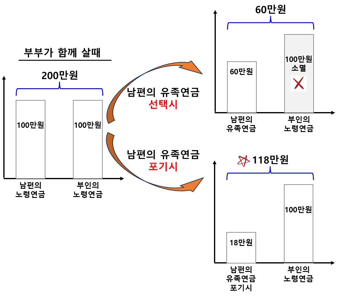 - 부인의 노령연금 선택 시 : 남편의 유족연금을 포기하면 유족연금 60만 원의 30%인 18만 원은 지급됩니다. 그러므로 18만 원 + 본인의 노령연금 100만 원을 더하면 118만 원을 받을 수 있습니다.