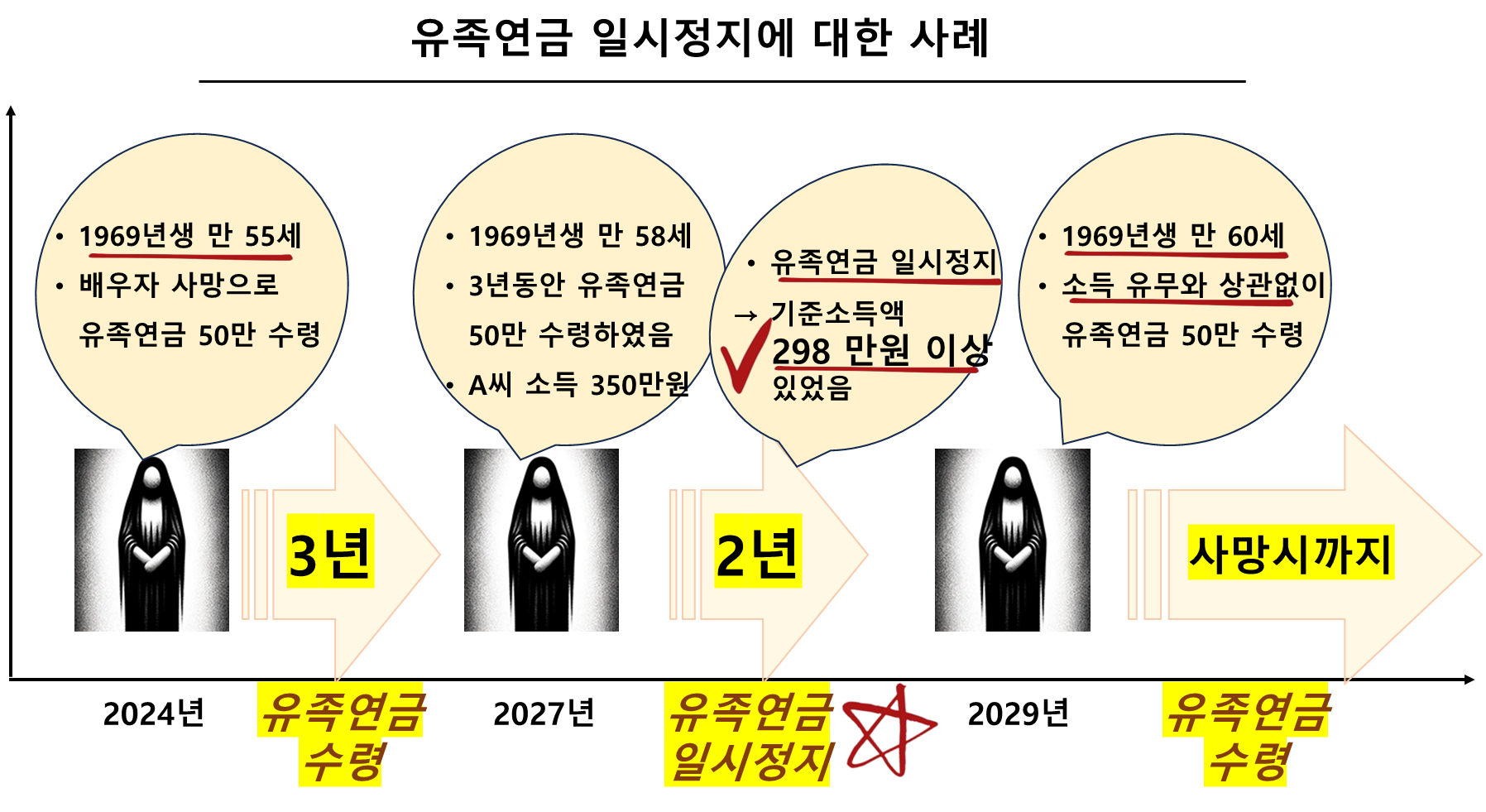 - 단 여기서 2027년에도 유족연금에 대한 소득 상한선 기준은 298만 원이라고 가정하겠습니다.