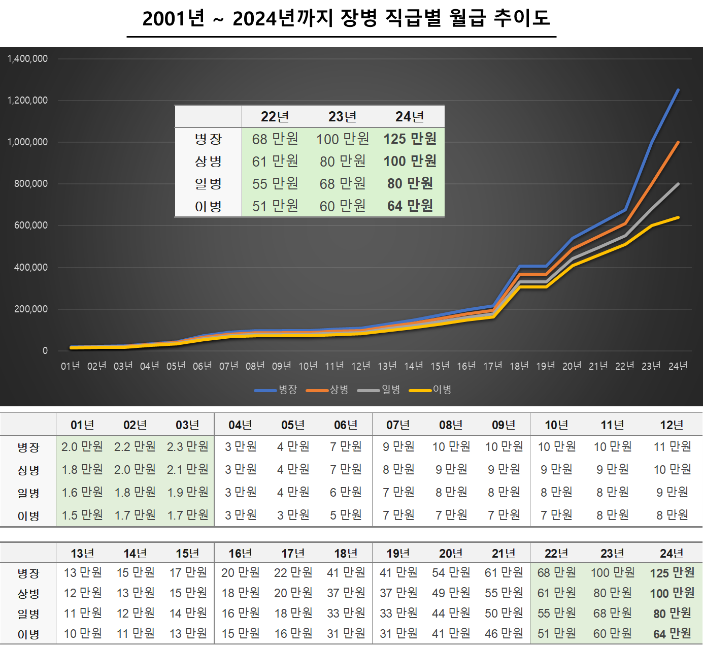 아래 그래프는 대한민국 장병의 직급별 월급을 2001년부터 2024년도까지의 그래프로 나타낸 추이도입니다.