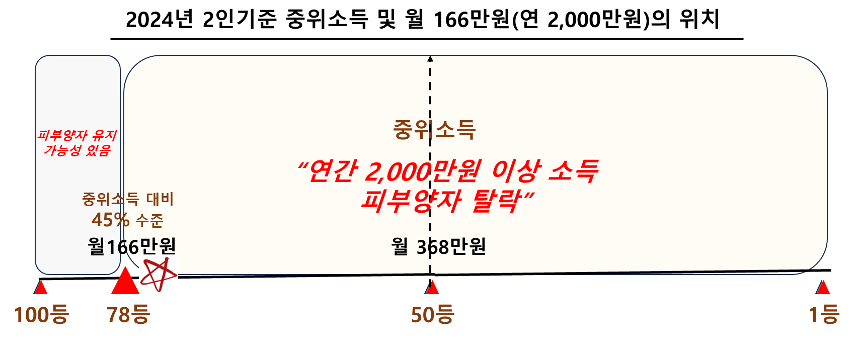 2024년 2인가족 기준 중위소득이 368만 원이며 166만 원은 중위소득 대비 45% 수준입니다. 166만 원의 월 소득을 단순 계산을 해보면 1~100등 중 78등에 속하는 수준입니다.