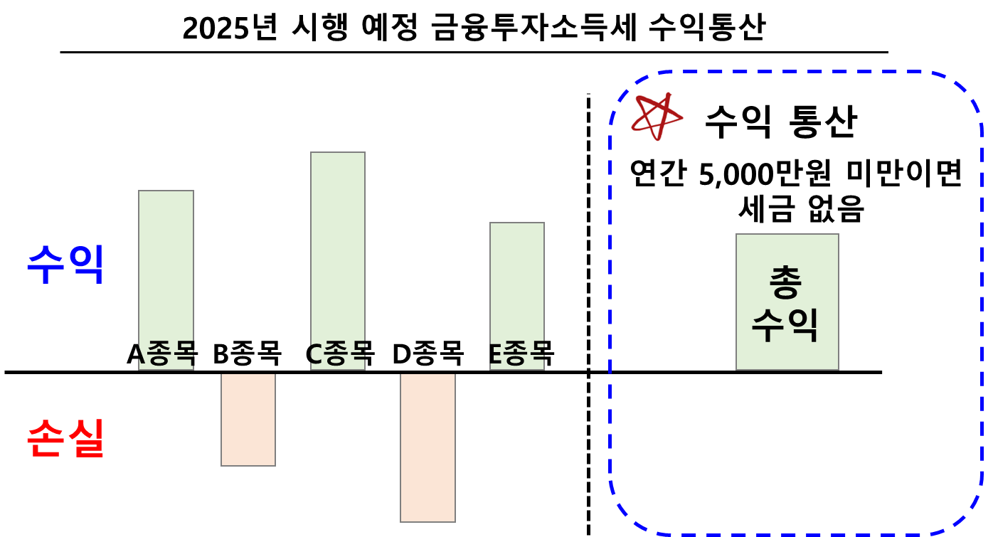 개인적으로 금융투자소득세의 가장 큰 장점은 바로 '손익통산'이라고 생각합니다. 즉 수익과 손실을 합쳐서 세금을 부과한다는 말입니다. 물론 여기서 수익통산은 국내그룹이나, 기타 그룹도 모두 동일합니다. 아래 그림처럼 예를 들어 국내 주식에 투자를 하는 경우에, 손실종목과 수익 종목이 골고루 섞여 있을 가능성이 큽니다. 이를 전체를 통합한 전체 수익이 5,000만 원만 넘지 않으면 기존과 동일하게 세금은 없습니다.