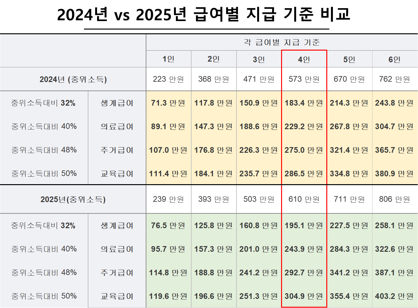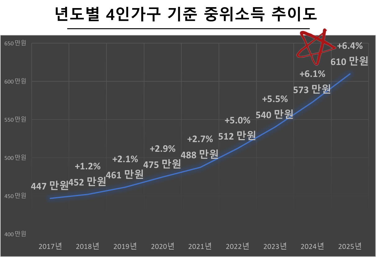 그런데 2025년 기준 중위소득이 2024년 대비 4인가구 기준 2024년 573만 원 → 2024년 610만 원으로 약 6.4%가 상승하였으며, 역대 최대 상승폭입니다.