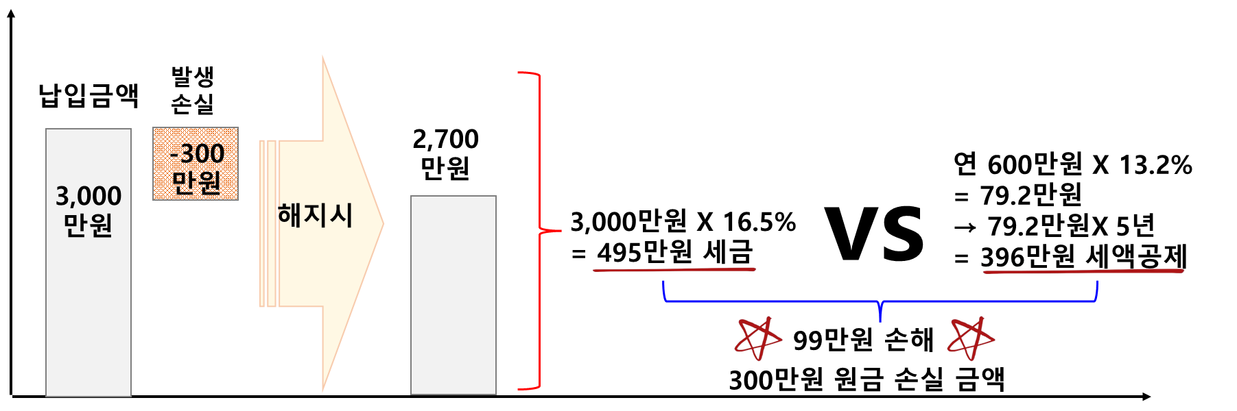 - 총원금이 3,000만 원 + 운용손실 300만 원 = 총 2,700만 원입니다. 여기서 해지 시 세금은 수익은 없으니 세금은 없지만, 그렇다고 손실을 감안해 주지 않습니다. 즉 원금 3,000만 원* 16.5% = 495만 원의 세금이 부과됩니다.