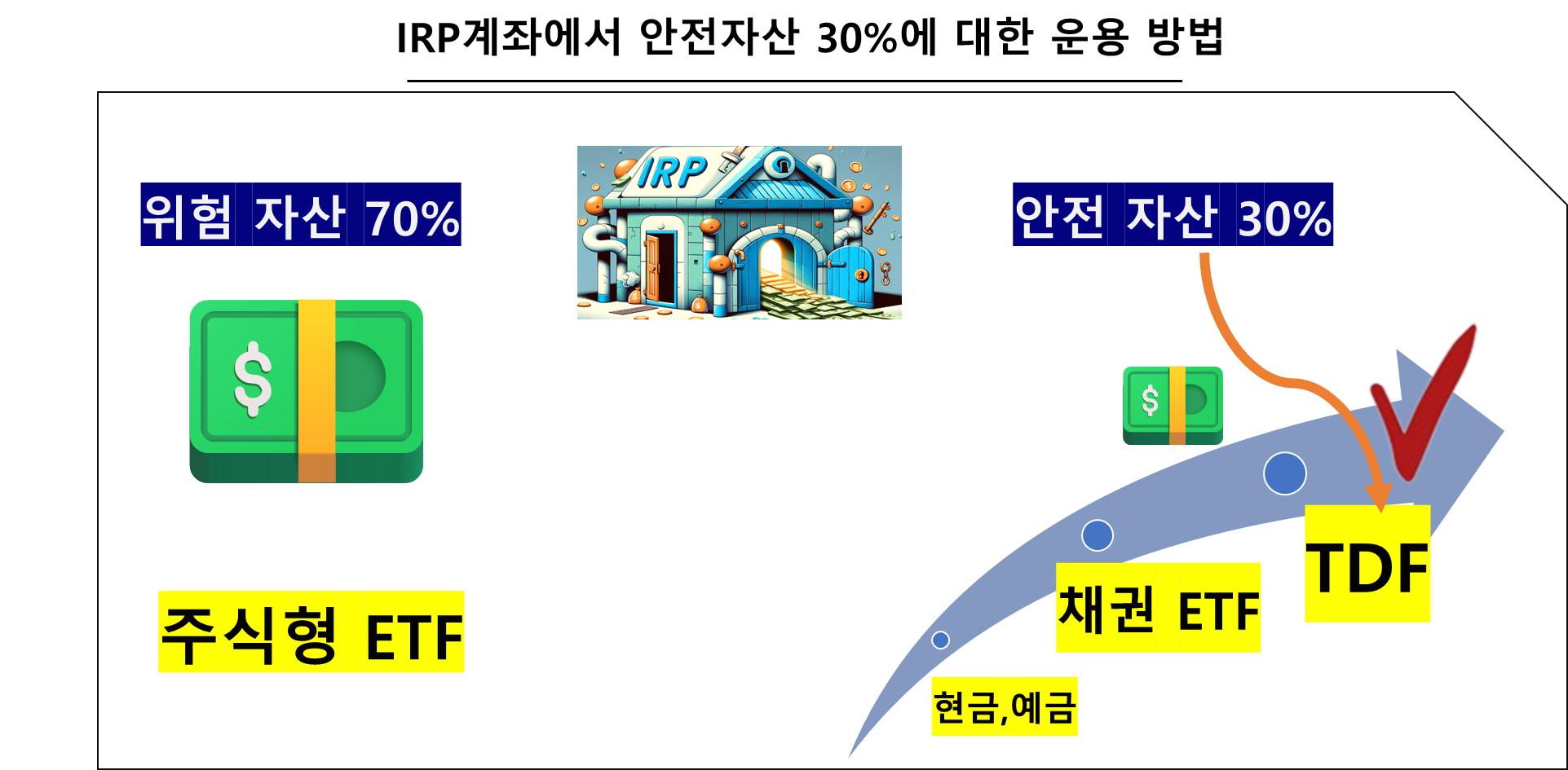 그런데 여기에서 중요한 포인트는 빈티지 연도에 상관없이 '모든 TDF는 안전자산으로 분류'된다는 것입니다. 따라서 아래 그림과 같이 70%는 위험자산이라고 표현되는 적극적인 형태의 투자를 주로 ETF를 중심으로 진행하되, 나머지 안전자산 30%는 현금이나 예금 형태로 투자하지 마시고 이러한 TDF에 투자하는 것도 합리적인 선택이라고 생각합니다.