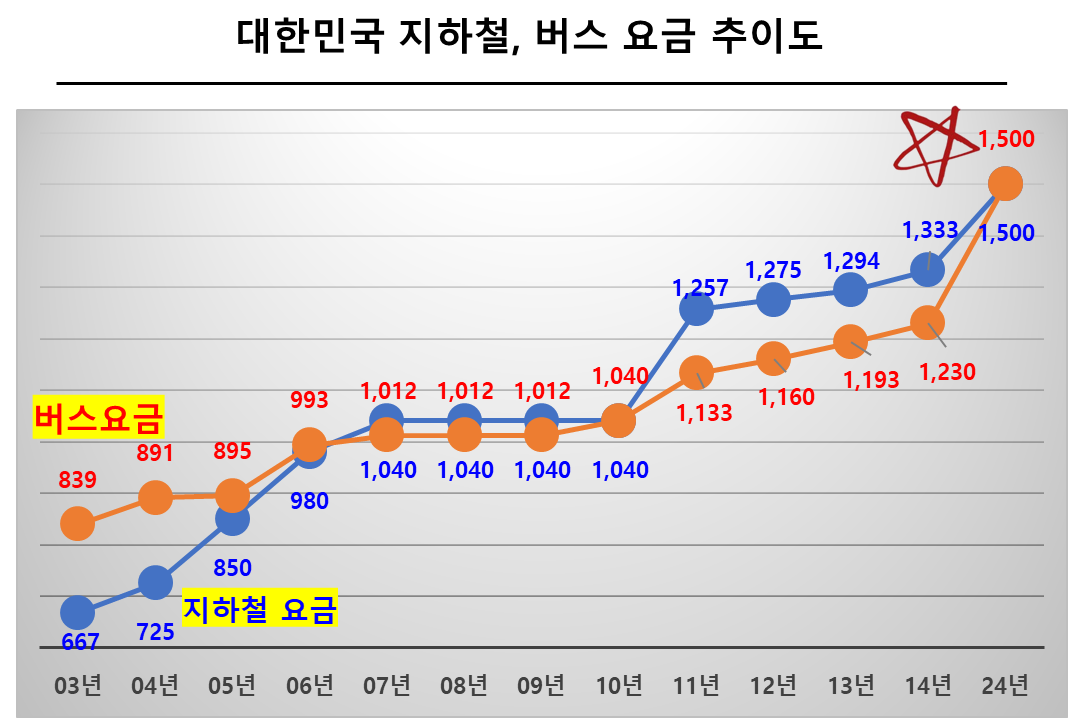 요즘 유튜브를 통하여 해외여행을 하면서 그 나라 현지 물가를 비교체험하는 영상이 많이 있습니다. 요즘 대한민국도 워낙 물가가 많이 올라서 살기 힘든 세상이 되었지만, 어찌 되었건 대중교통비만큼은 아직까지 저렴한 편에 속하는 것이 사실입니다. 그러나 우리는 대한민국에서 살고 있기에 당장 오르는 대중교통요금에 대한 부담은 커 질 수밖에 없습니다. 아래 그림은 대한민국의 지하철, 버스 요금에 대한 2003년도부터의 2024년까지 추이도를 그래프로 나타낸 것입니다.