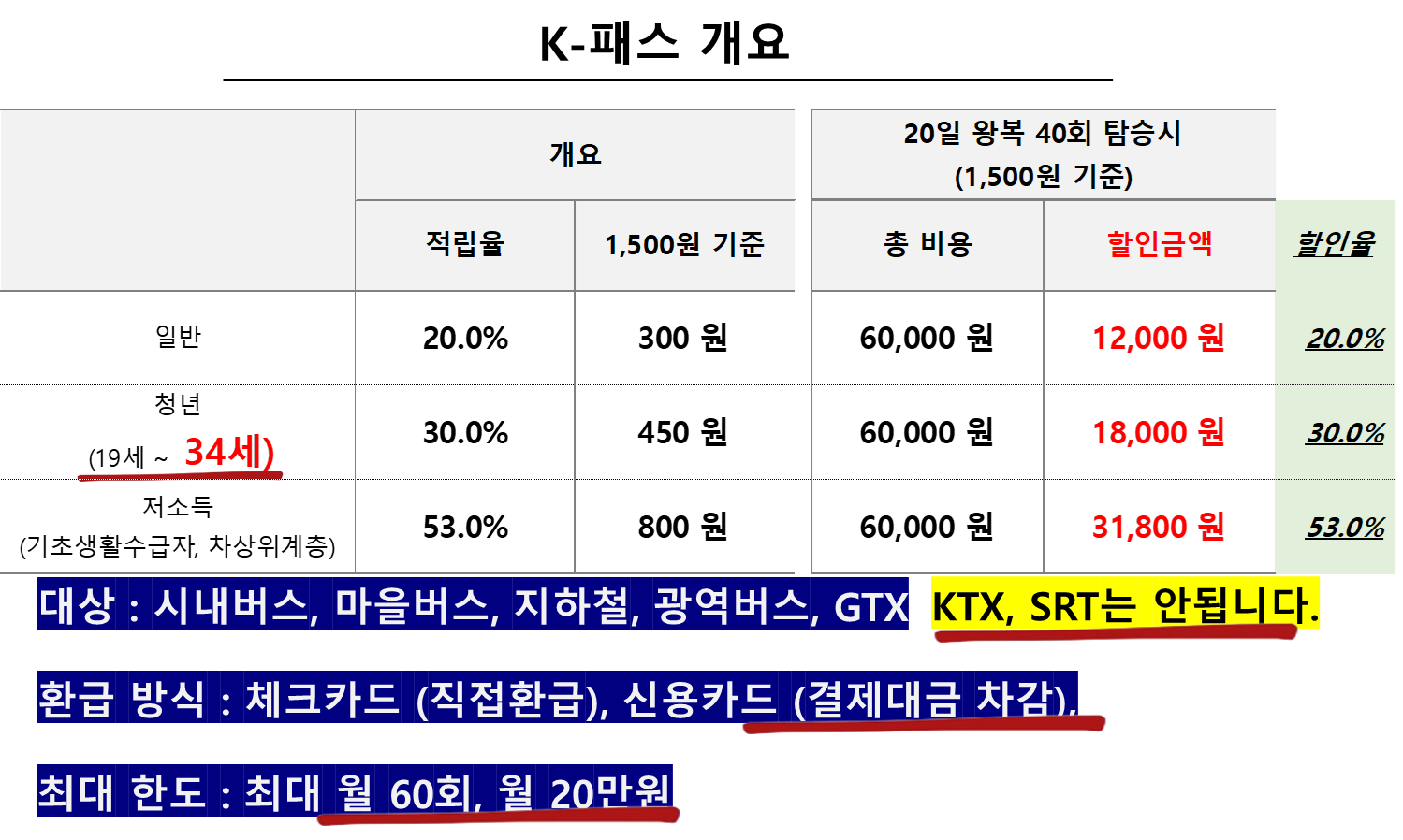 보통 정부에서 시행하는 복지정책에서 '나는 대상자가 아니다'인 경우가 많이 있습니다. 하지만 K-패스 사업만큼은 대한민국 국민이라면 누구나 그 혜택을 받을 수 있습니다.