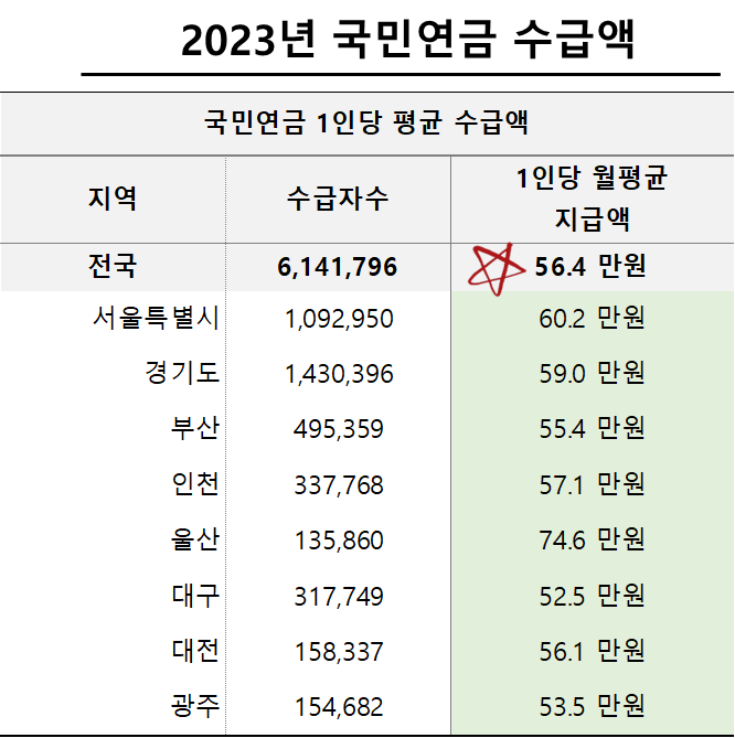 아래 그림은 2023년 현재 국민연금의 전체 및 지역별 평균 수급액입니다. 전국 평균 월 56만 원 정도로 2023년 현재를 살아가기에는 분명 충분히 모자란 금액입니다.