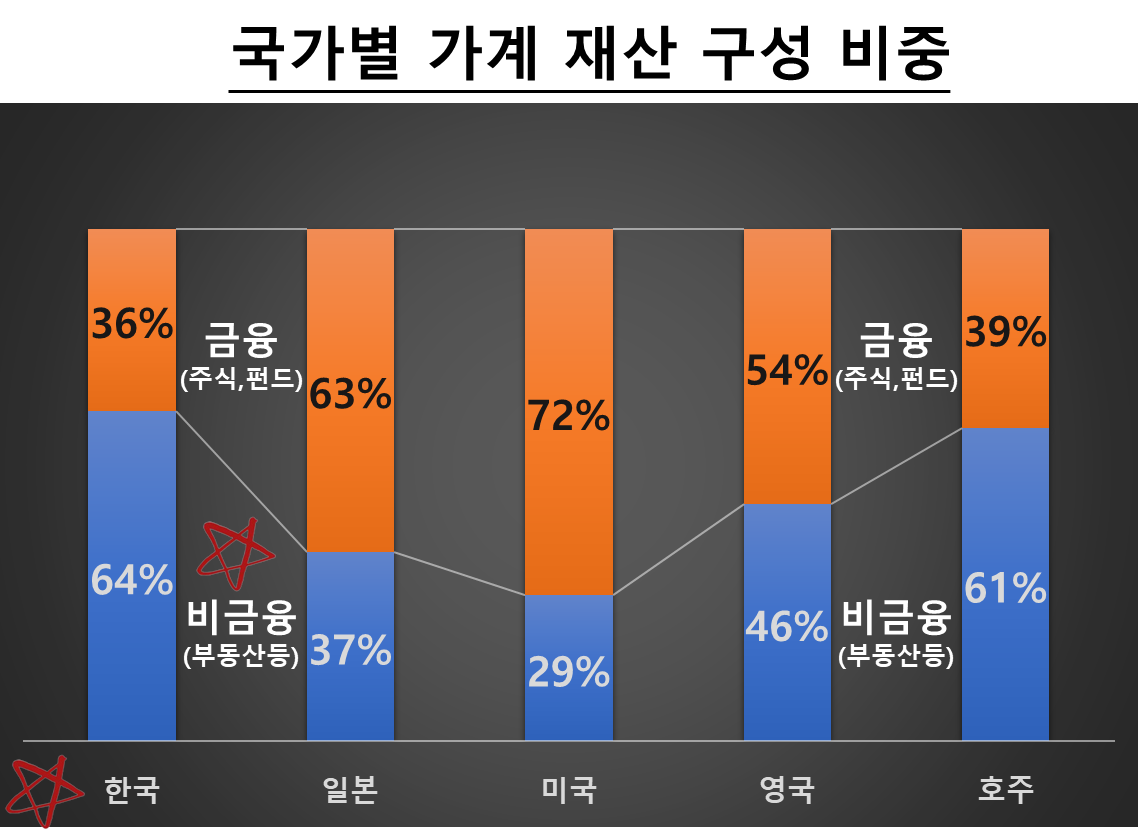 - 대한민국 : 비금융(부동산) 64%, 금융 (주식, 펀드, 현금) 36%