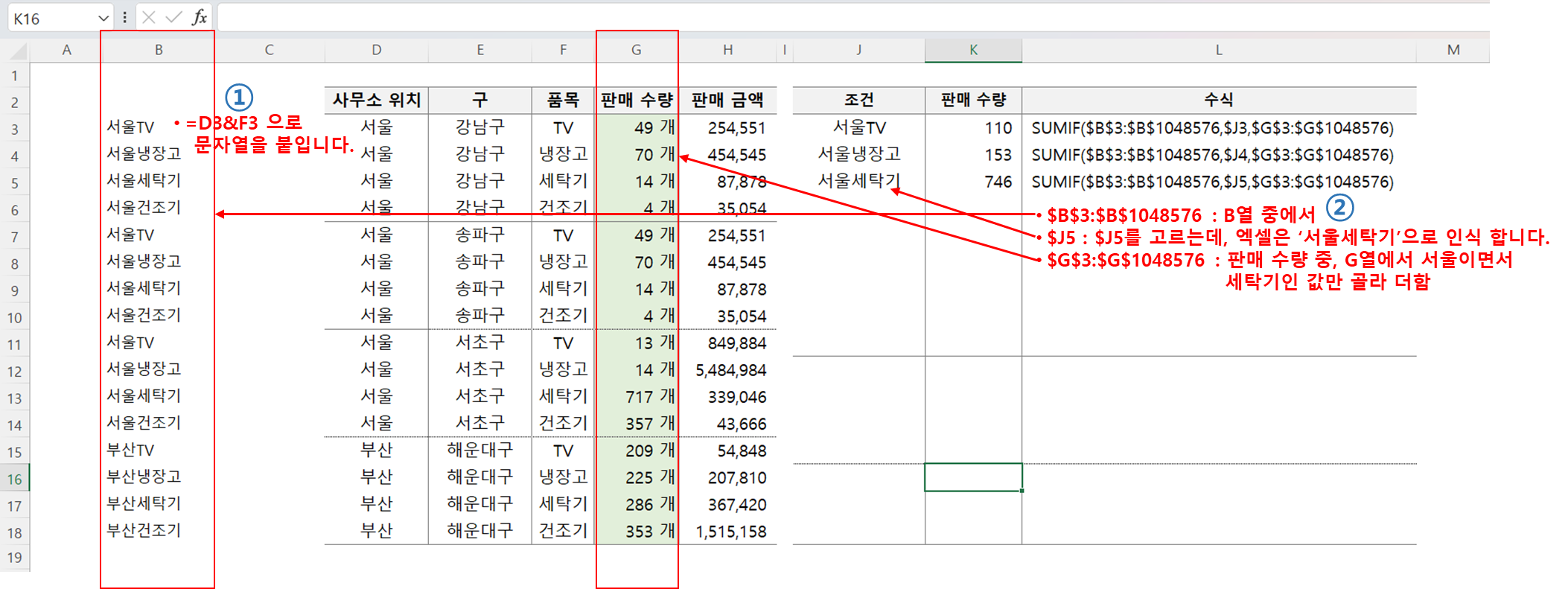 아래 그림과 같이 서울에서 판매되는 세탁기의 합계를 구하고 싶다고 가정합니다. 그런데 이 경우 sumif 함수를 사용하기 전에 먼저 새로운 조건에 해당하는 부분을 만들어야 합니다. 아래 순서대로 설명드리겠습니다.